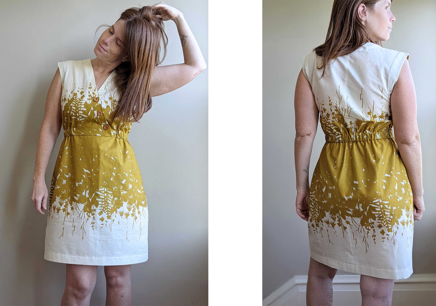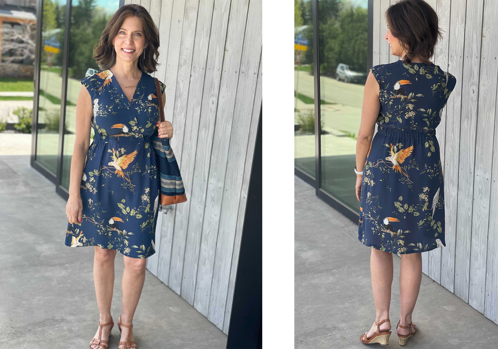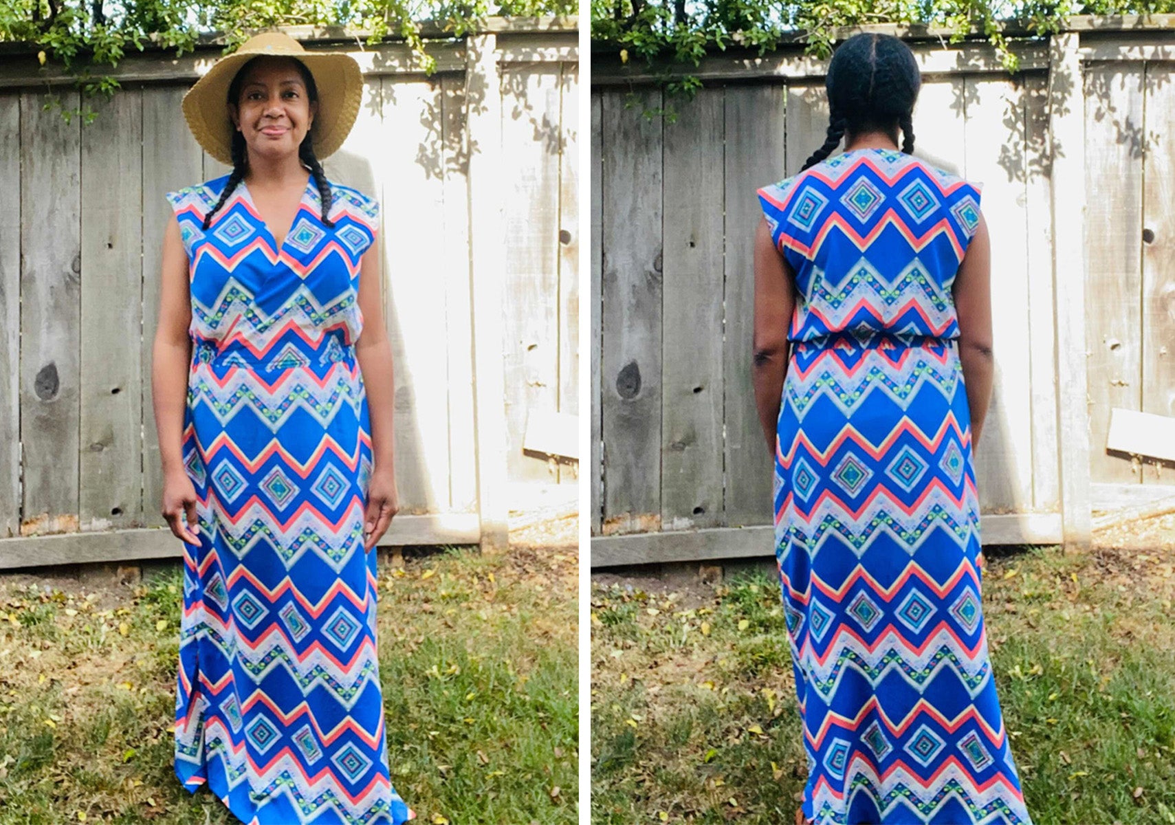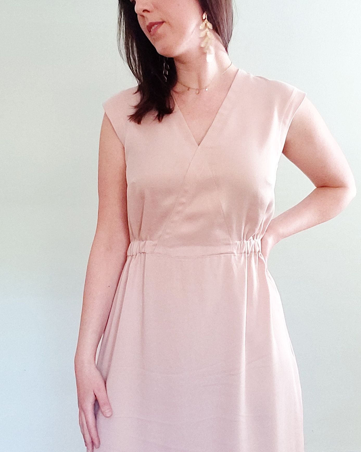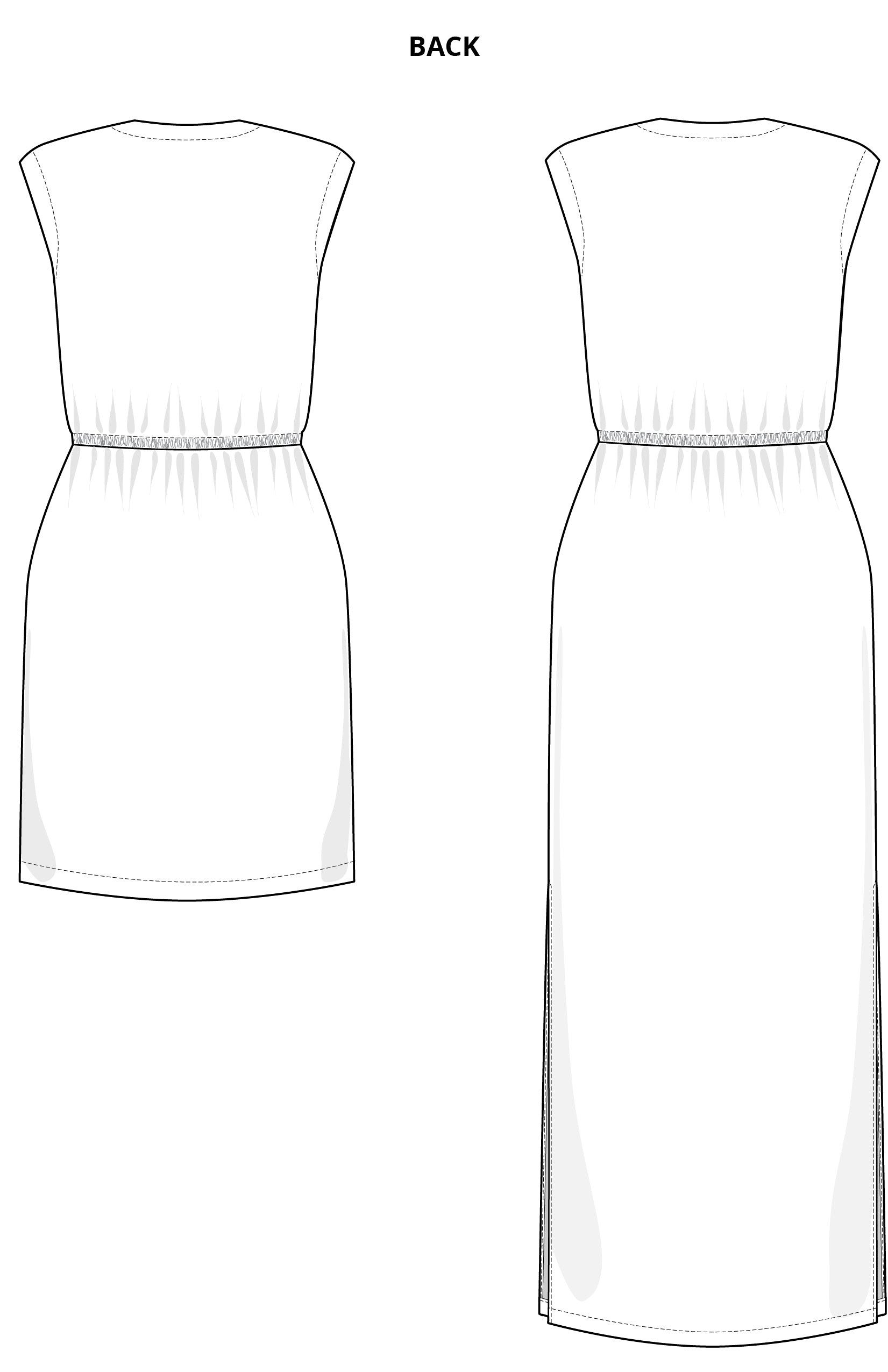 The Ava Dress is a sleeveless, popover dress with a faux wrap bodice and elasticated waist. The sleeveless shoulder edge is extended slightly beyond the shoulder point for a modern silhouette. Ava can be sewn as an above the knee dress length (VERSION A) or a maxi dress length (VERSION B). This is your new spring/summer go-to frock! Wear it casual with flat sandals or sneakers, layer it with your favorite cardigan or jean jacket, or dress it up with statement shoes and jewelry.
