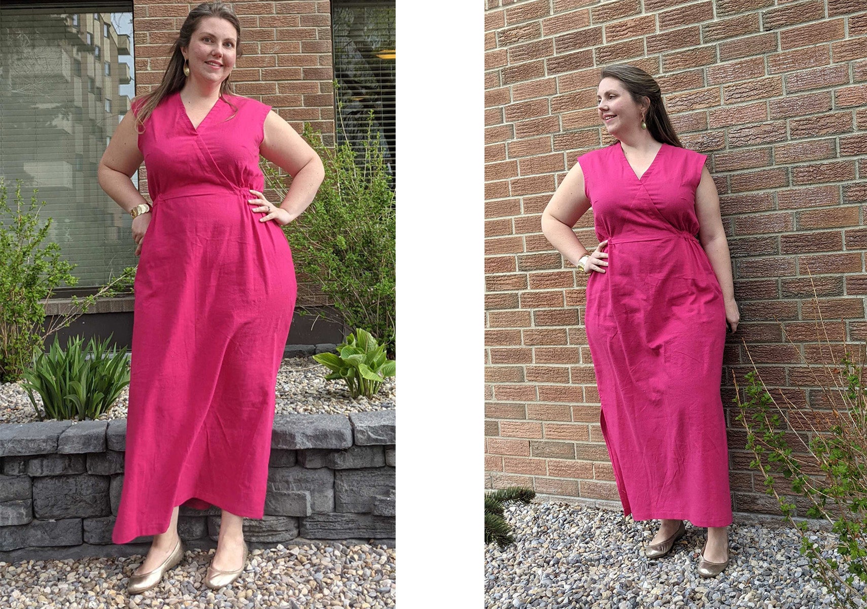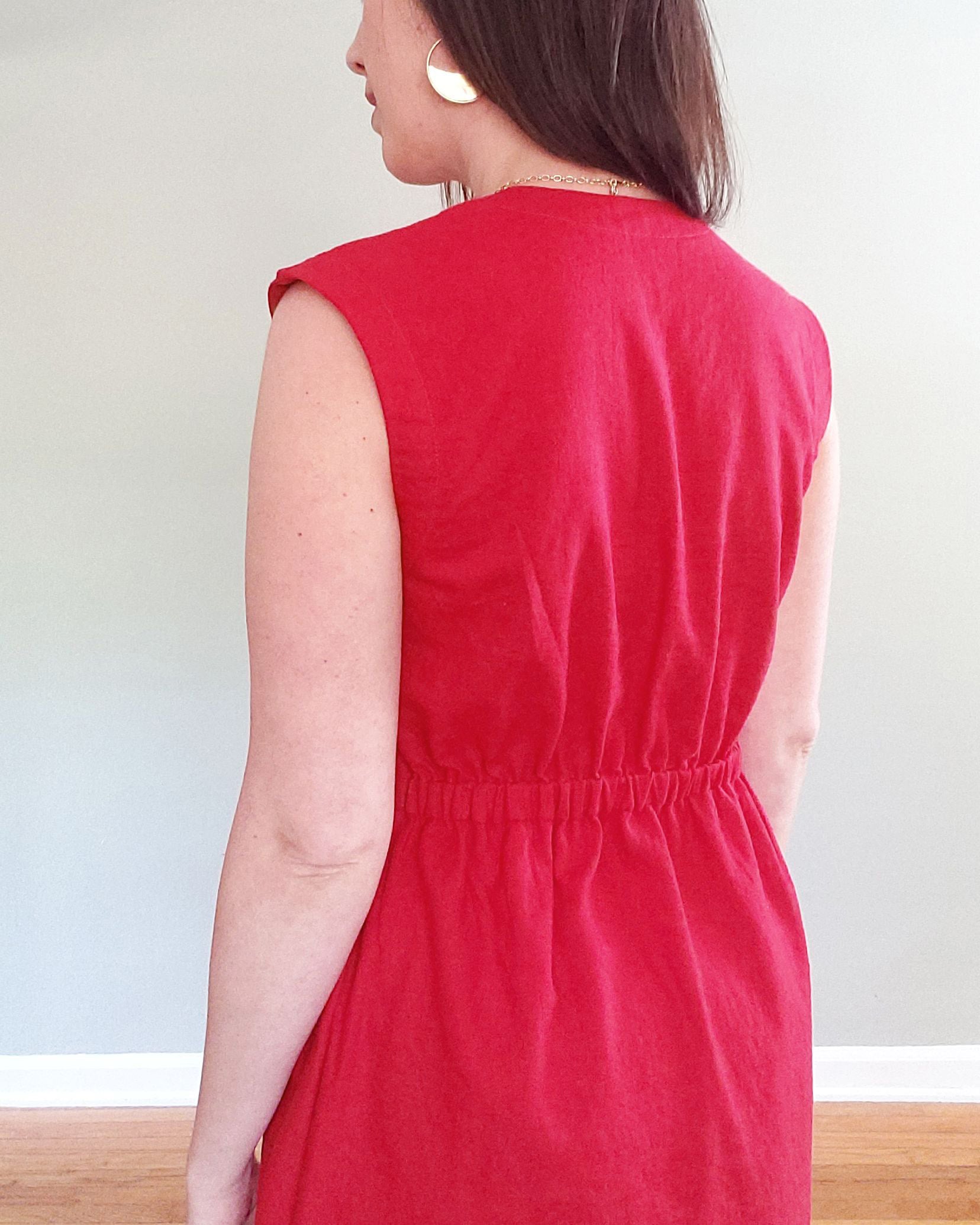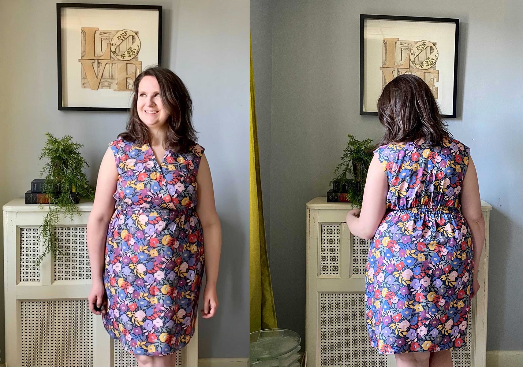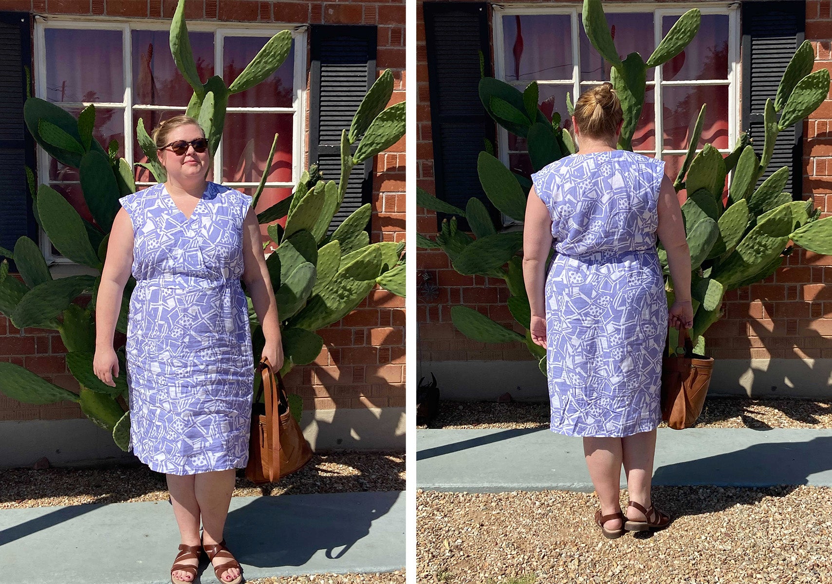 The Ava Dress is a sleeveless, popover dress with a faux wrap bodice and elasticated waist. The sleeveless shoulder edge is extended slightly beyond the shoulder point for a modern silhouette. Ava can be sewn as an above the knee dress length (VERSION A) or a maxi dress length (VERSION B). This is your new spring/summer go-to frock! Wear it casual with flat sandals or sneakers, layer it with your favorite cardigan or jean jacket, or dress it up with statement shoes and jewelry.