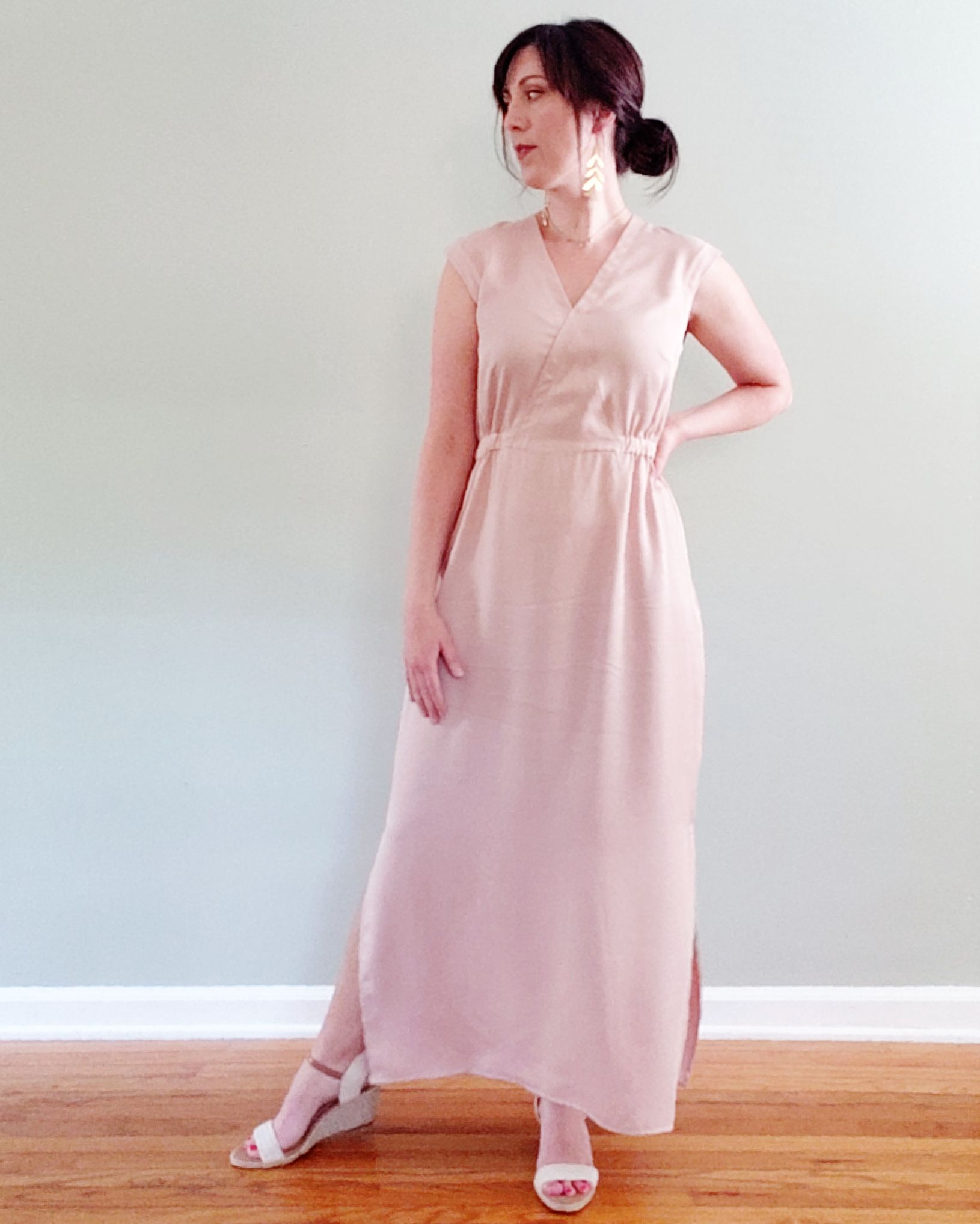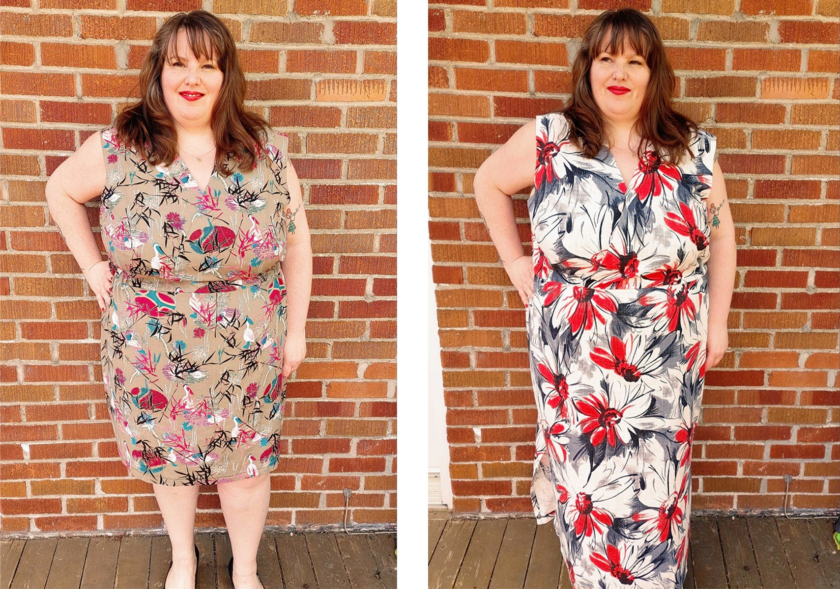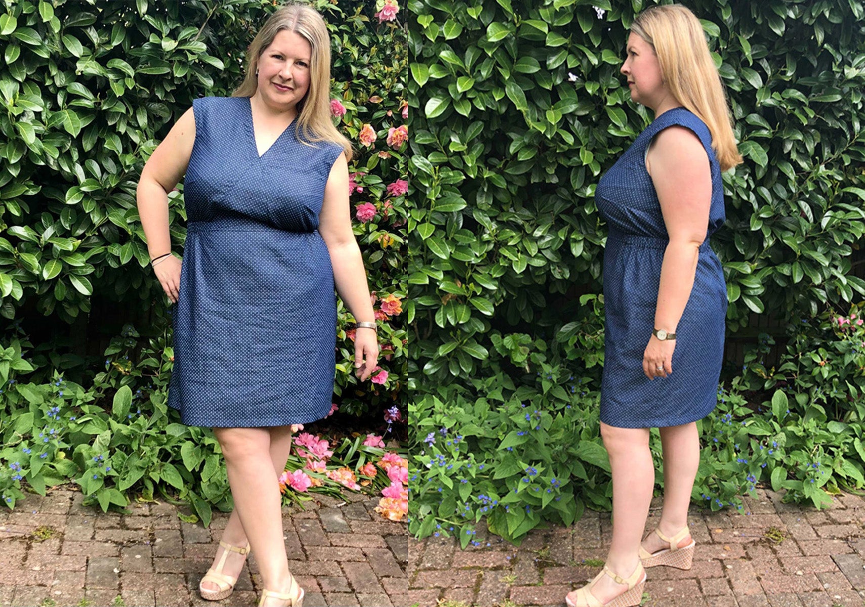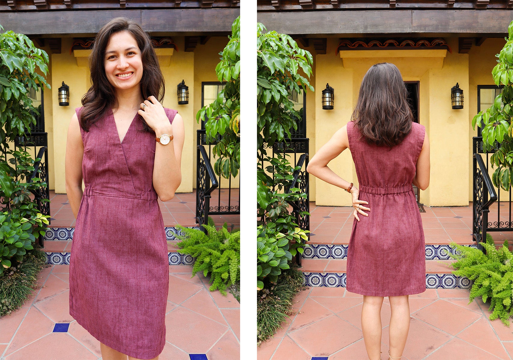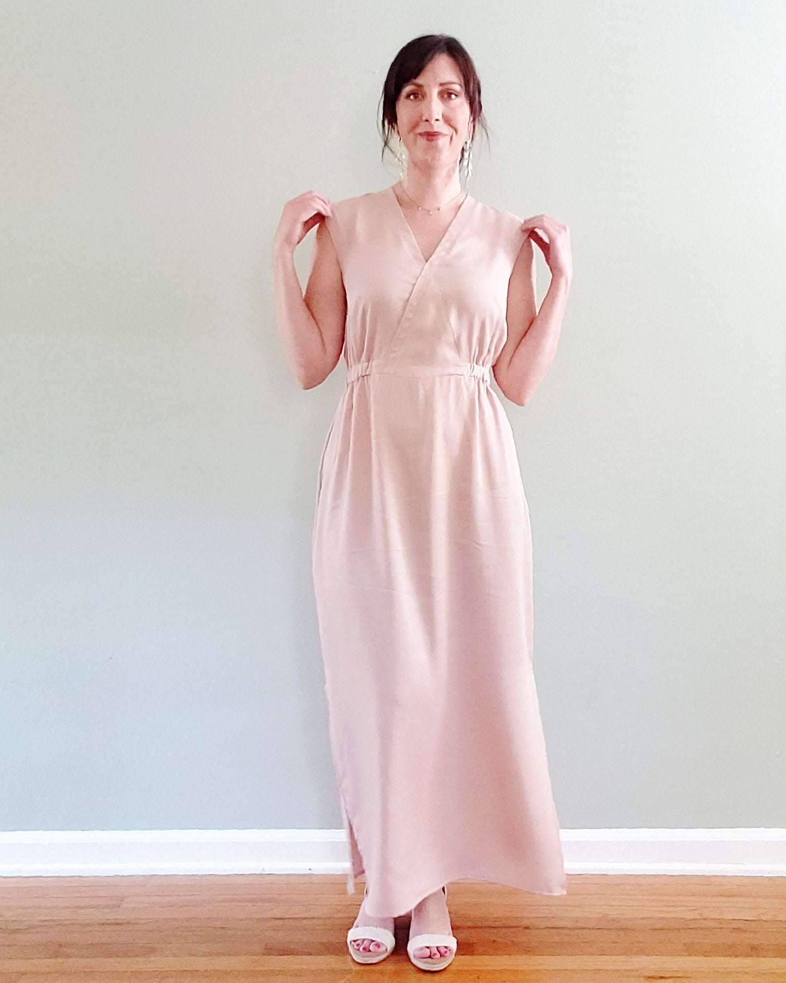 The Ava Dress is a sleeveless, popover dress with a faux wrap bodice and elasticated waist. The sleeveless shoulder edge is extended slightly beyond the shoulder point for a modern silhouette. Ava can be sewn as an above the knee dress length (VERSION A) or a maxi dress length (VERSION B). This is your new spring/summer go-to frock! Wear it casual with flat sandals or sneakers, layer it with your favorite cardigan or jean jacket, or dress it up with statement shoes and jewelry.