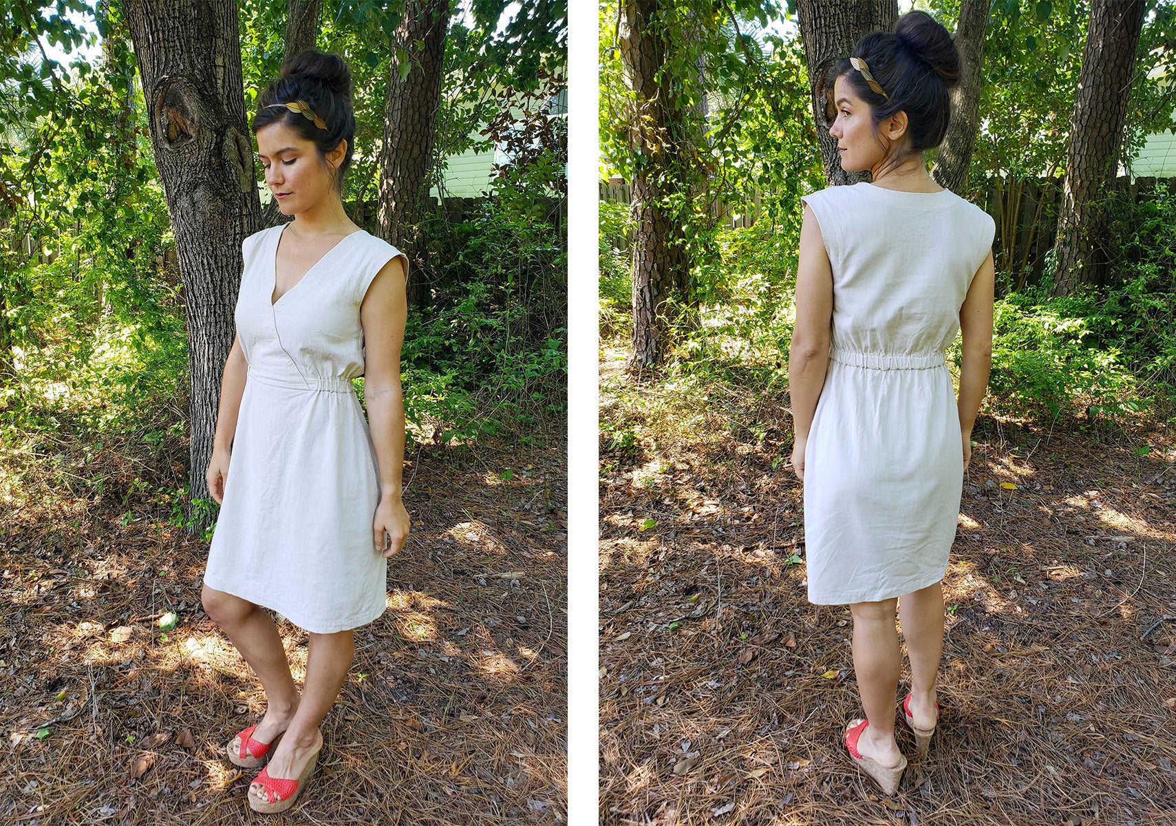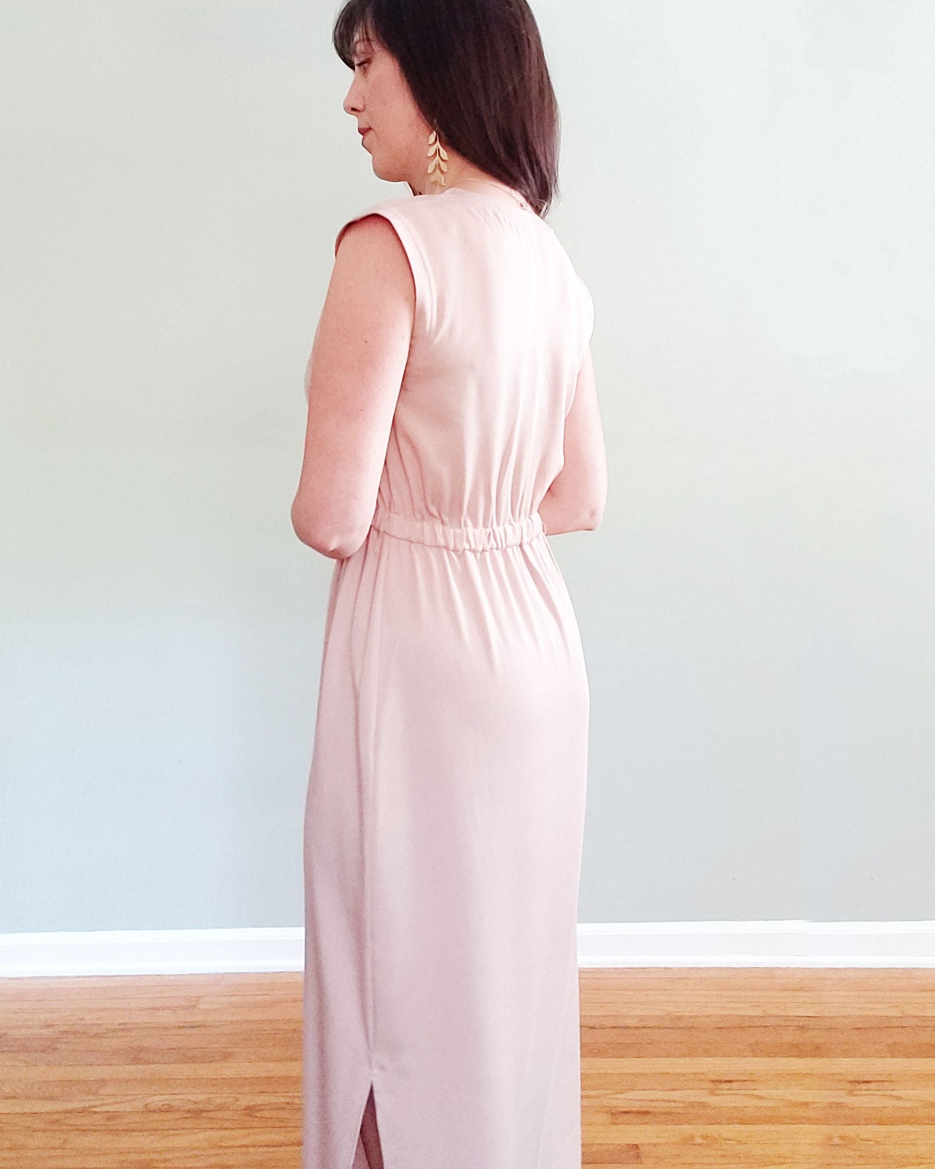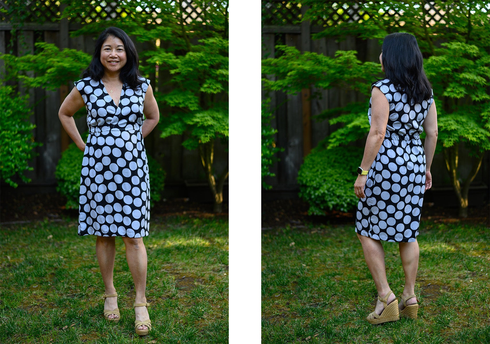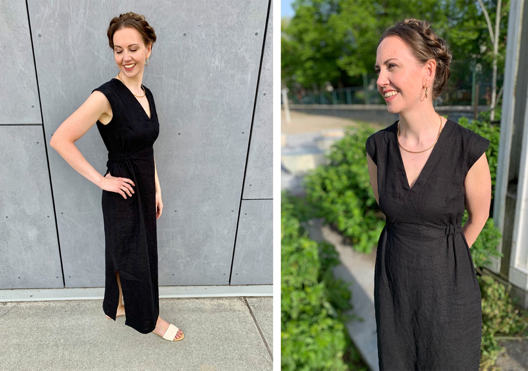 The Ava Dress is a sleeveless, popover dress with a faux wrap bodice and elasticated waist. The sleeveless shoulder edge is extended slightly beyond the shoulder point for a modern silhouette. Ava can be sewn as an above the knee dress length (VERSION A) or a maxi dress length (VERSION B). This is your new spring/summer go-to frock! Wear it casual with flat sandals or sneakers, layer it with your favorite cardigan or jean jacket, or dress it up with statement shoes and jewelry.