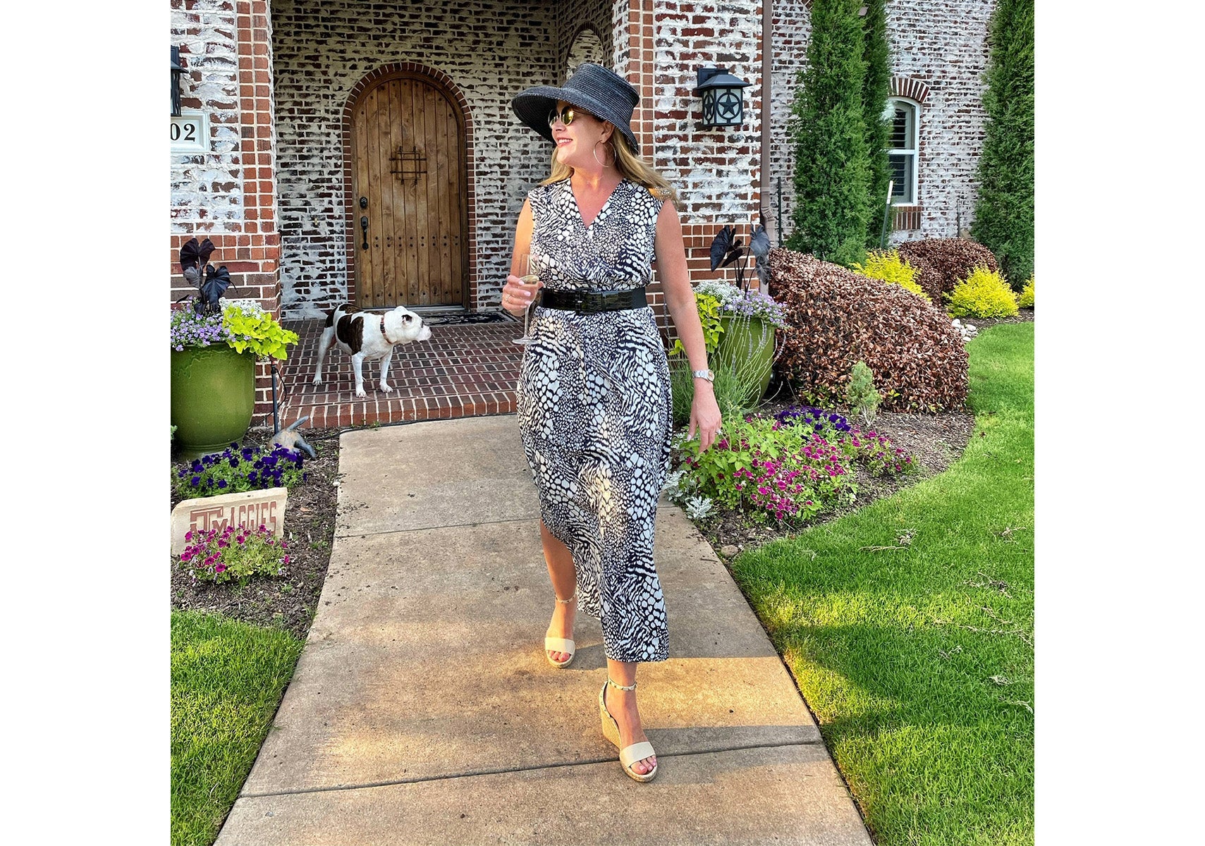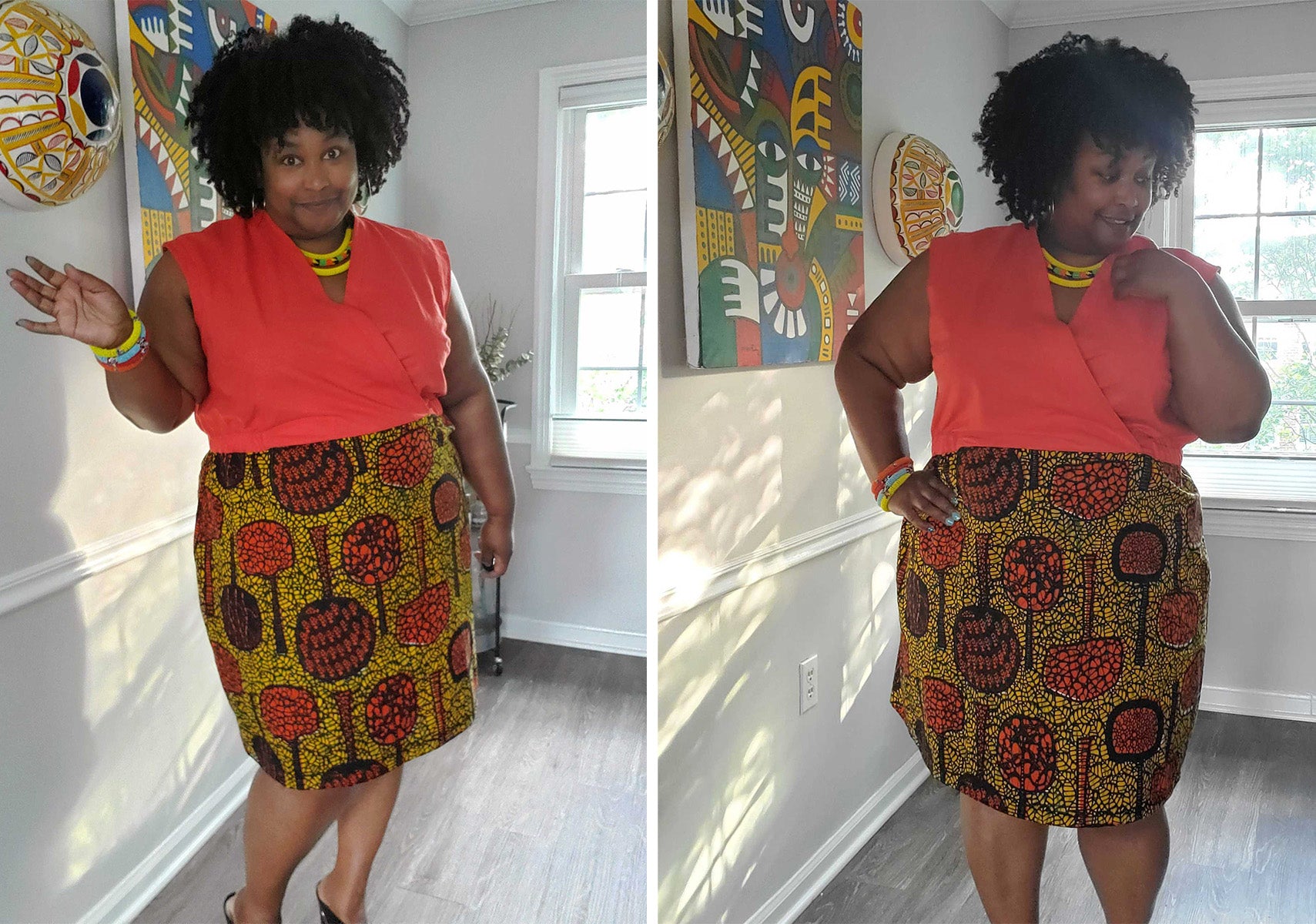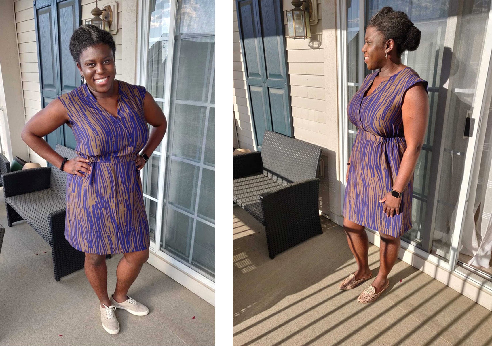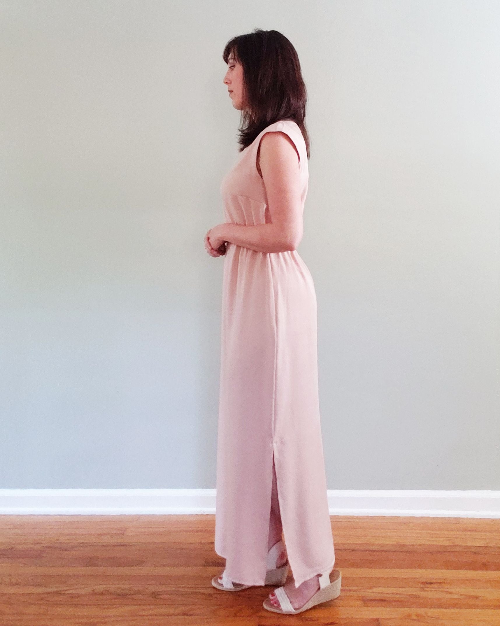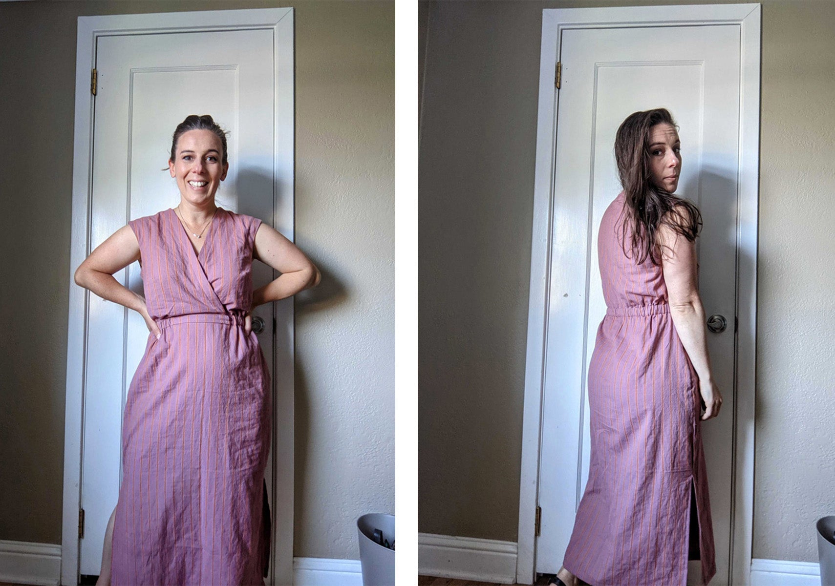 The Ava Dress is a sleeveless, popover dress with a faux wrap bodice and elasticated waist. The sleeveless shoulder edge is extended slightly beyond the shoulder point for a modern silhouette. Ava can be sewn as an above the knee dress length (VERSION A) or a maxi dress length (VERSION B). This is your new spring/summer go-to frock! Wear it casual with flat sandals or sneakers, layer it with your favorite cardigan or jean jacket, or dress it up with statement shoes and jewelry.