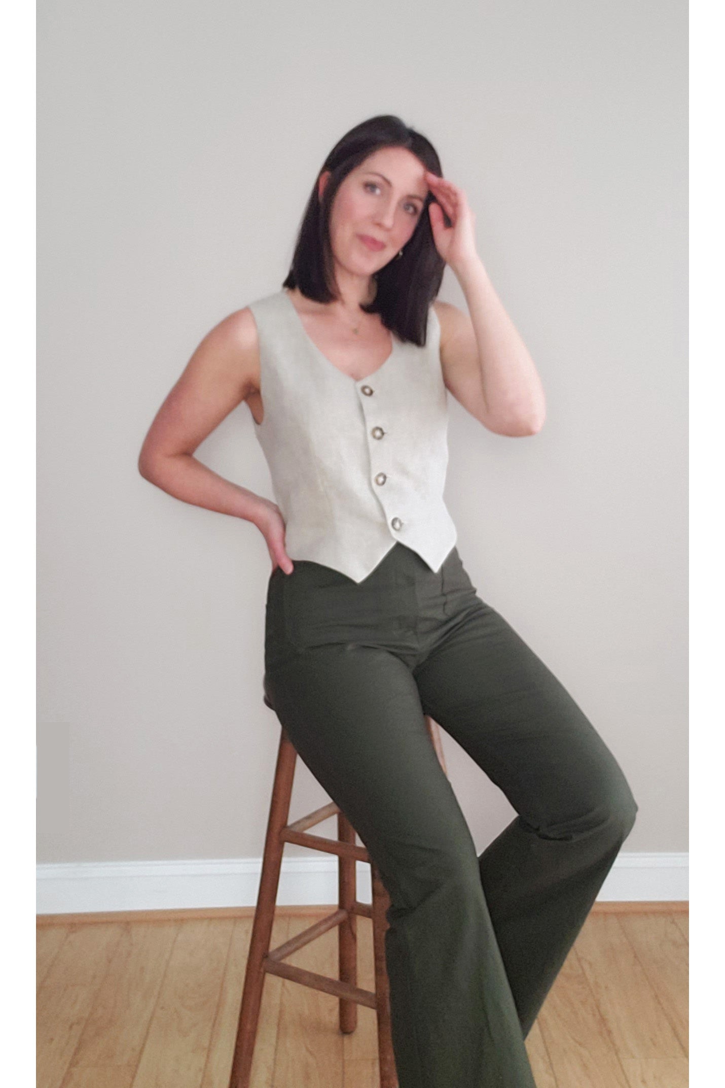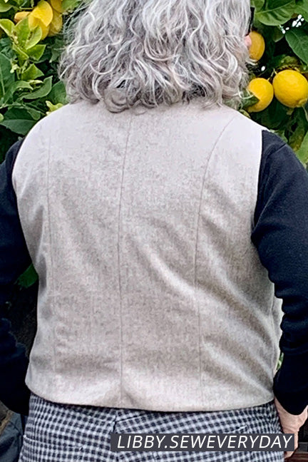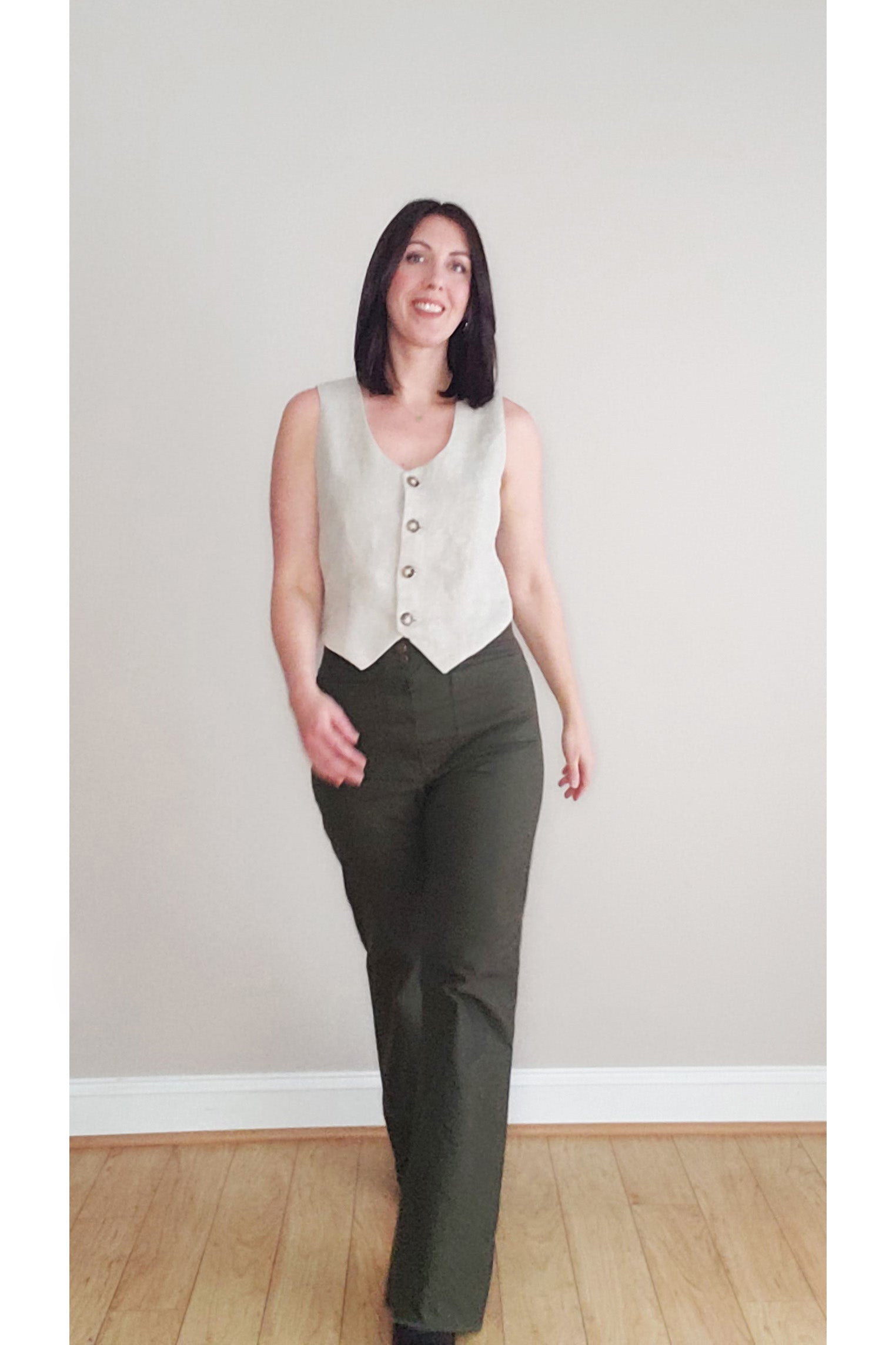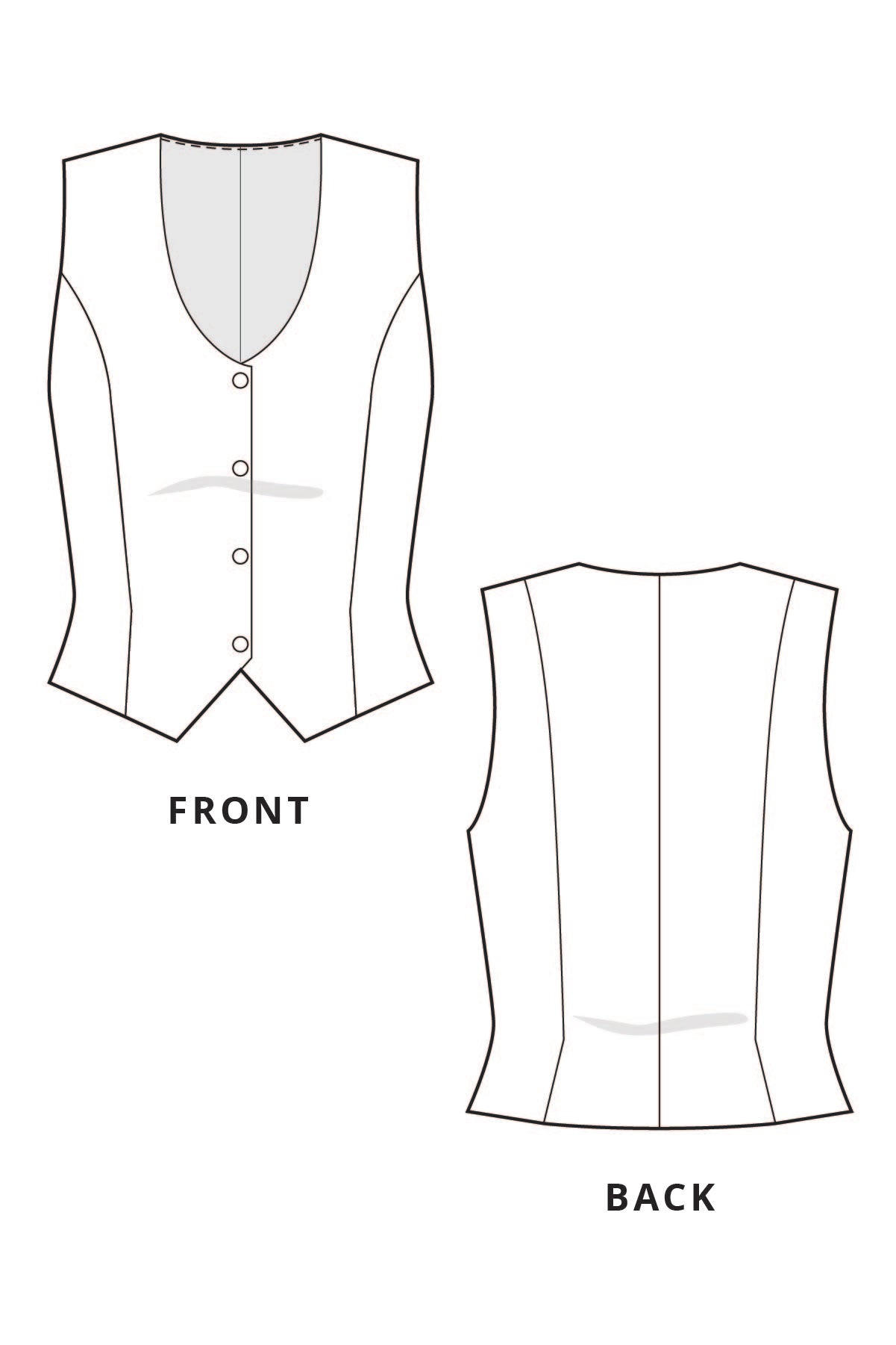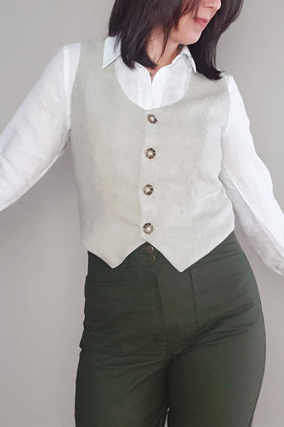 The Birch Vest is a lined waistcoat with princess seams, a deep scoop neckline, and a front button closure. A transitional wardrobe staple, Birch can be worn alone or layered with matching separates for a tailored or casual style.
