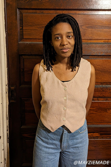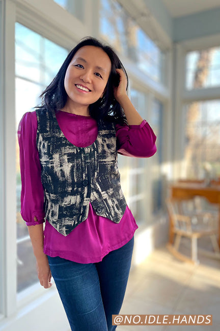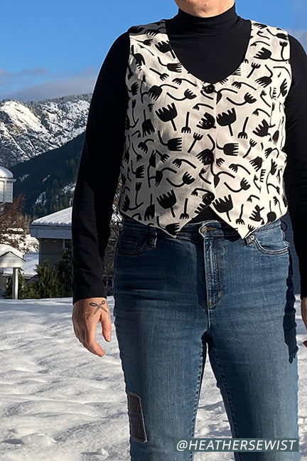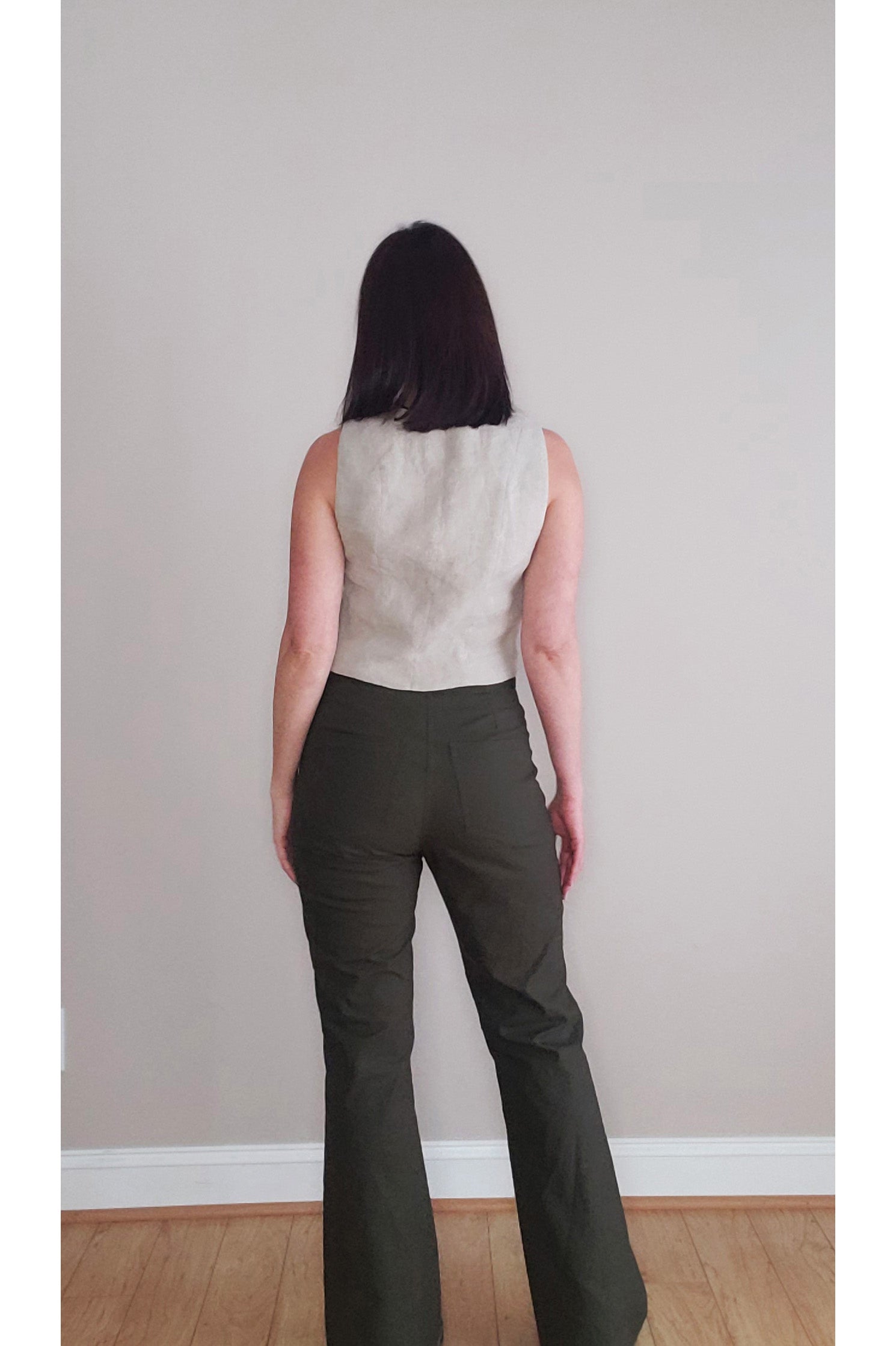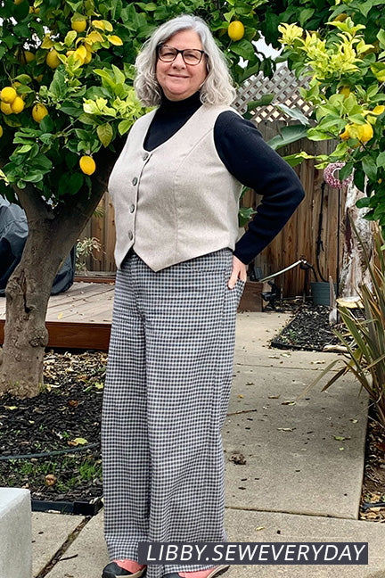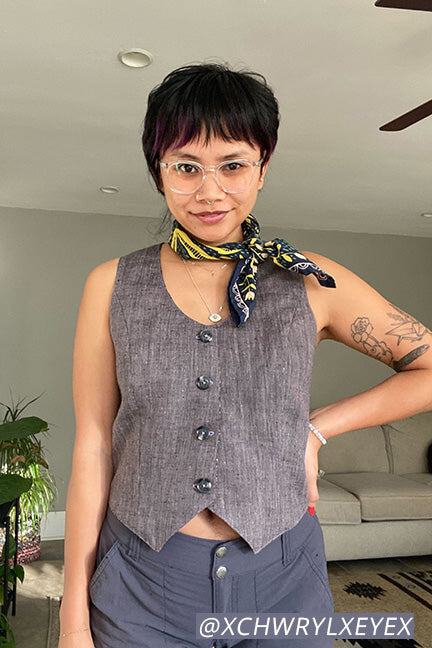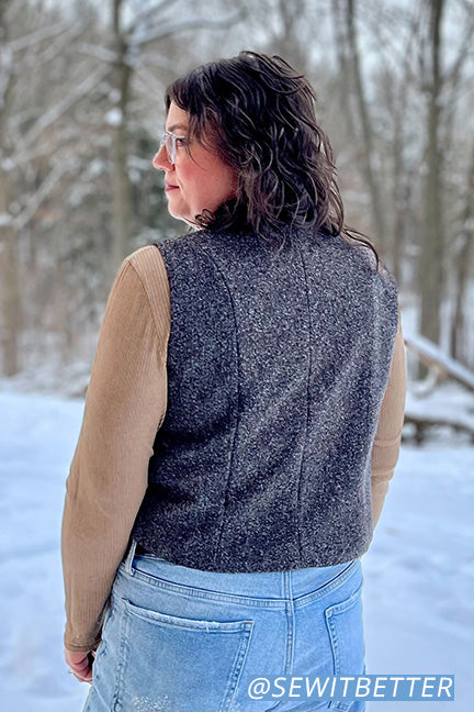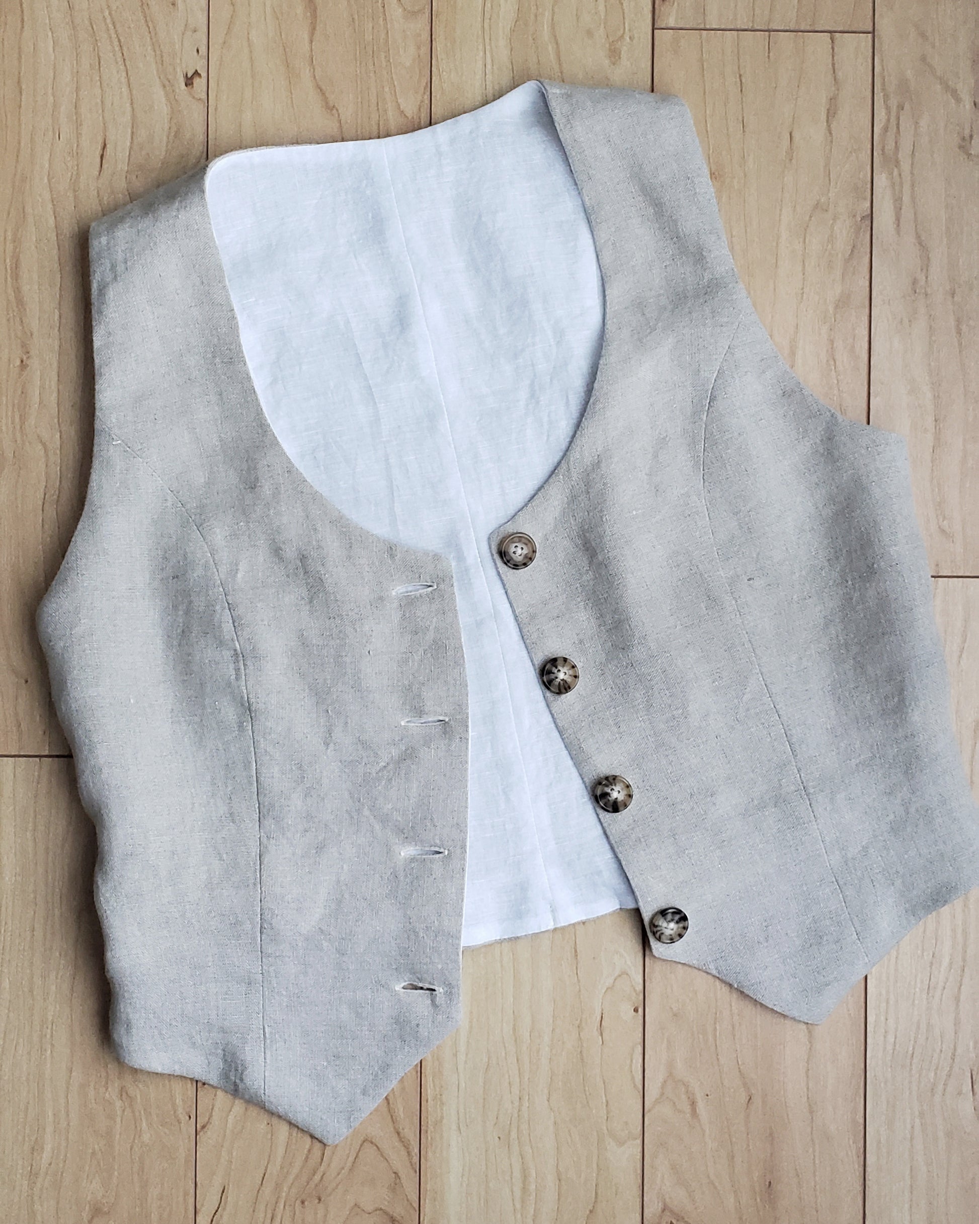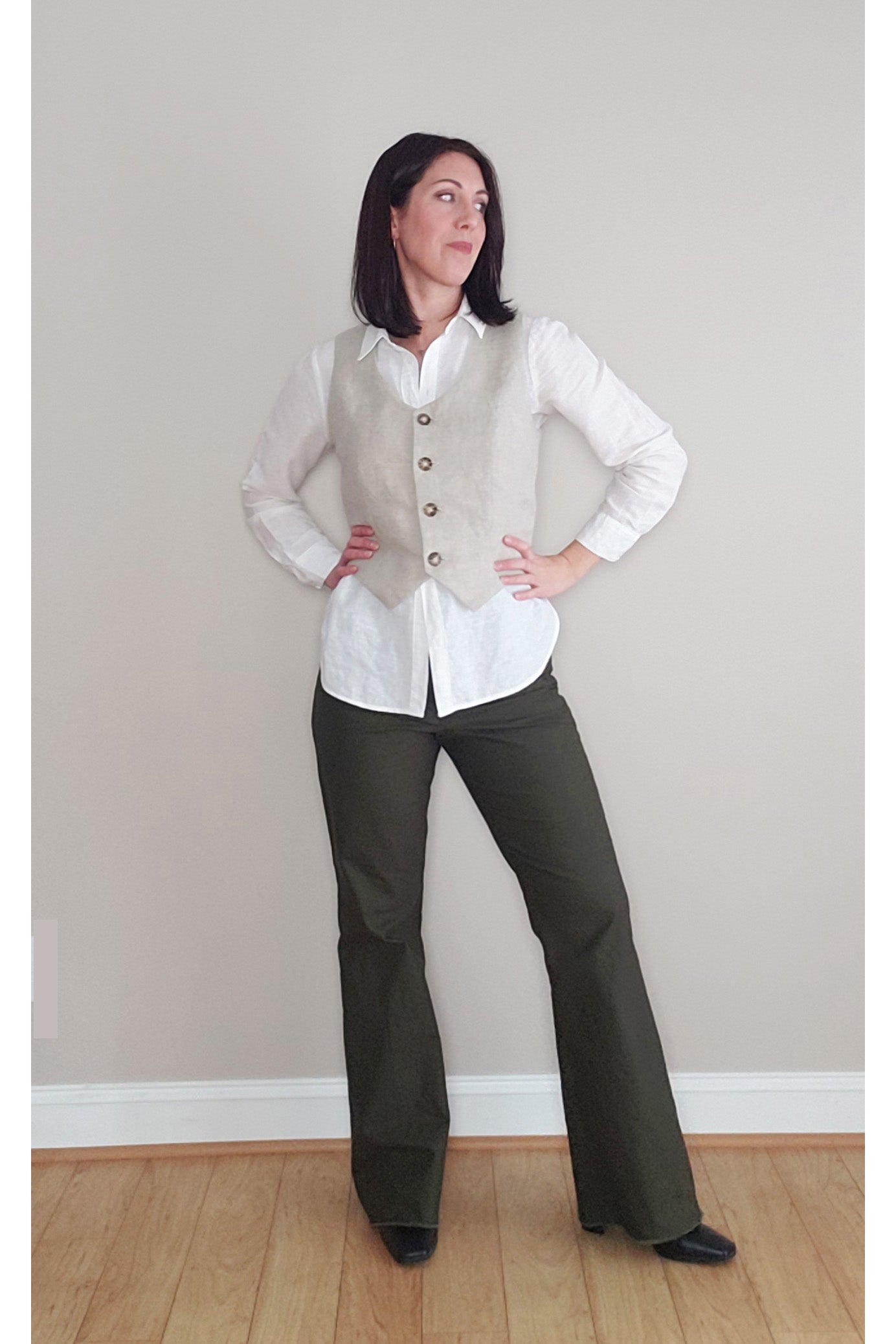 The Birch Vest is a lined waistcoat with princess seams, a deep scoop neckline, and a front button closure. A transitional wardrobe staple, Birch can be worn alone or layered with matching separates for a tailored or casual style.