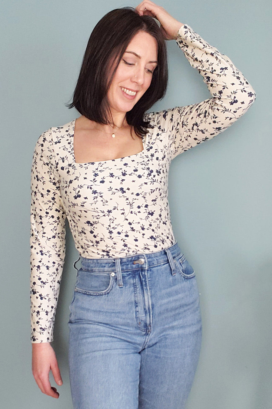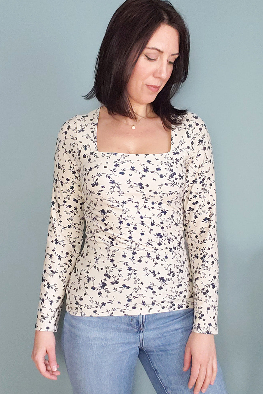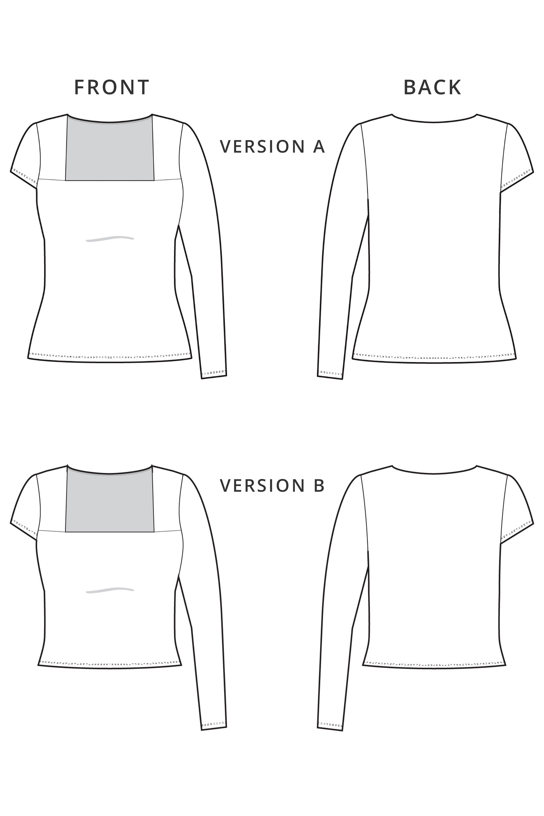 Say hello to your new favorite wear-with-everything tee. Brigit is fitted knit shirt with a plunging square neckline and the option of short or long sleeves. The bodice is partially lined with a clean finish along the neckline (no bindings), making this little wardrobe staple a simple sew. With its body-hugging silhouette and feminine neckline, Brigit offers a romantic spin on the basic tee.