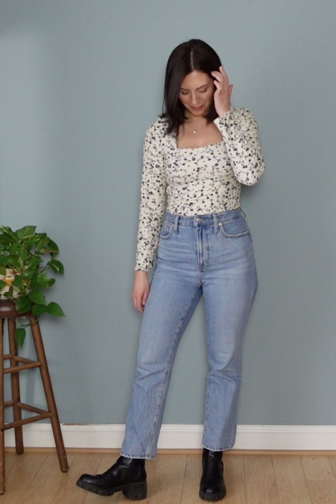 VERSION B is a cropped tee with the finished hem approximately 2" below the waistline