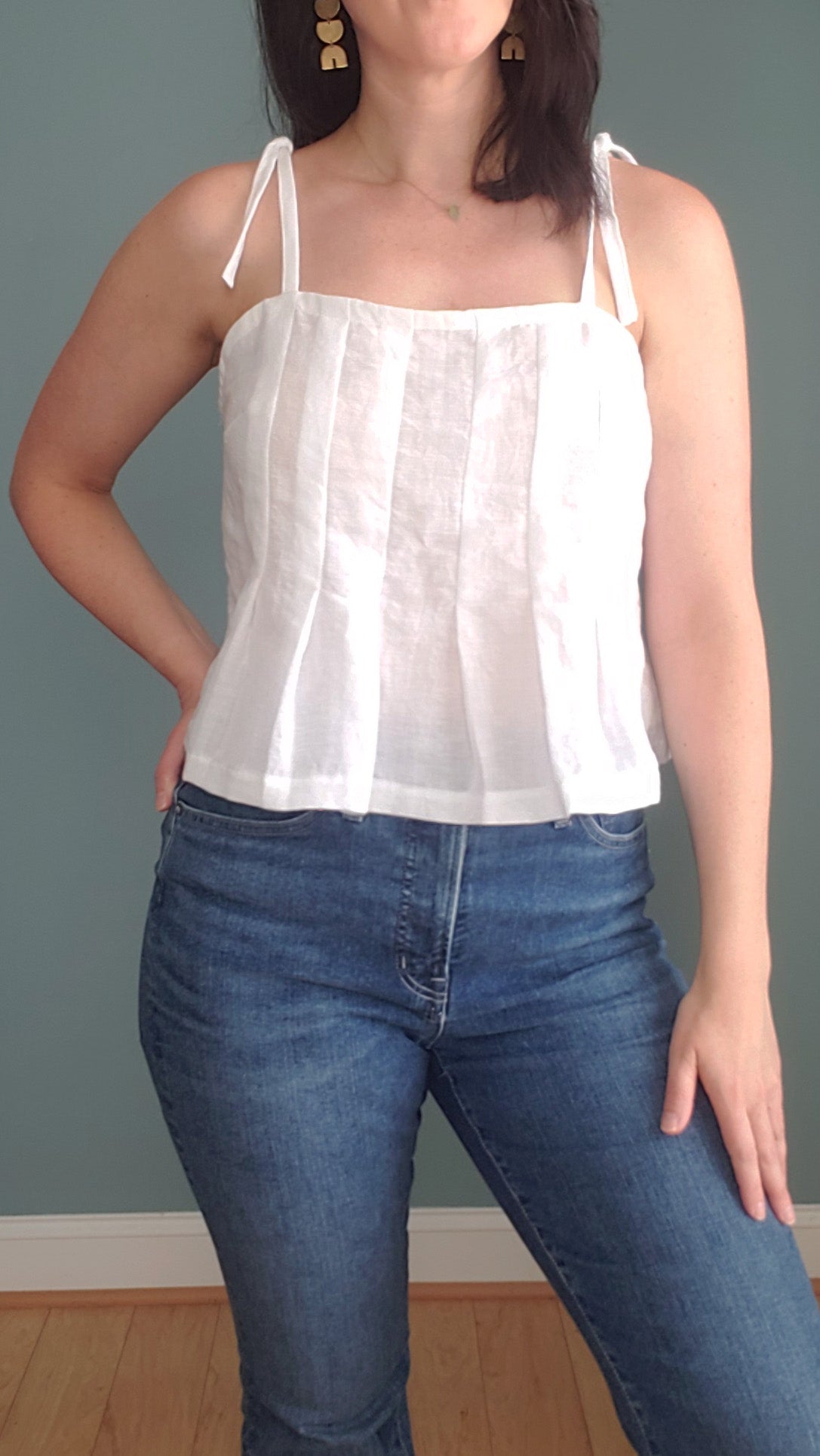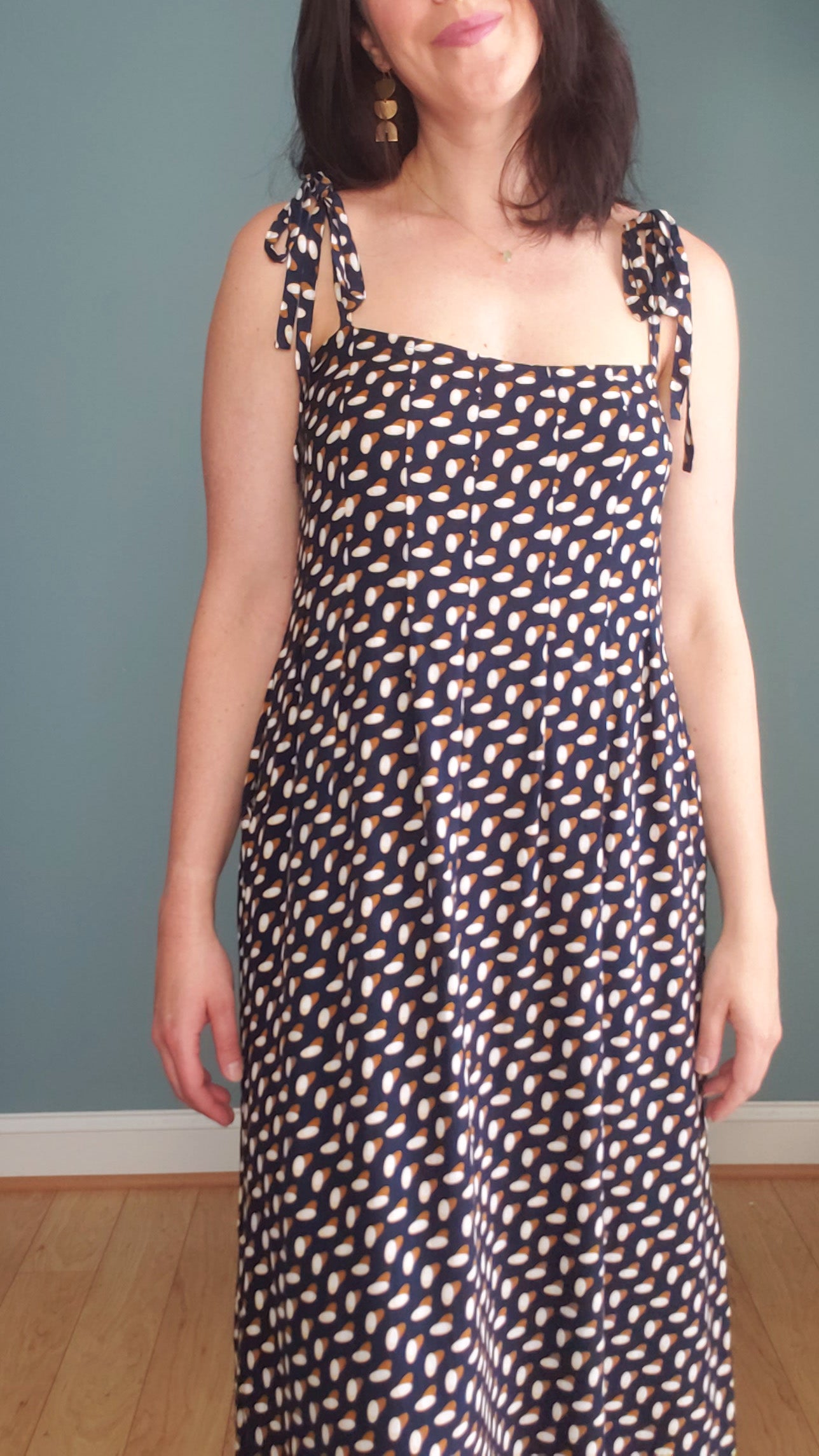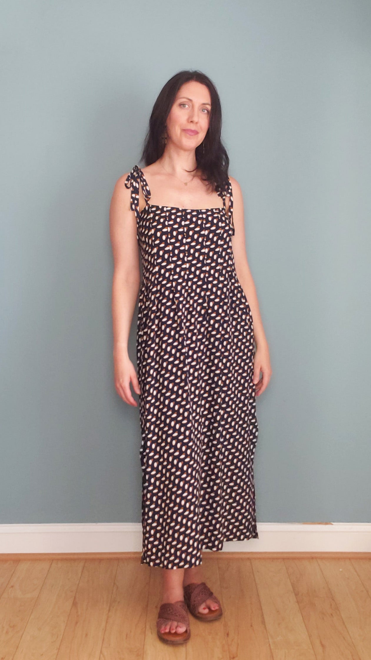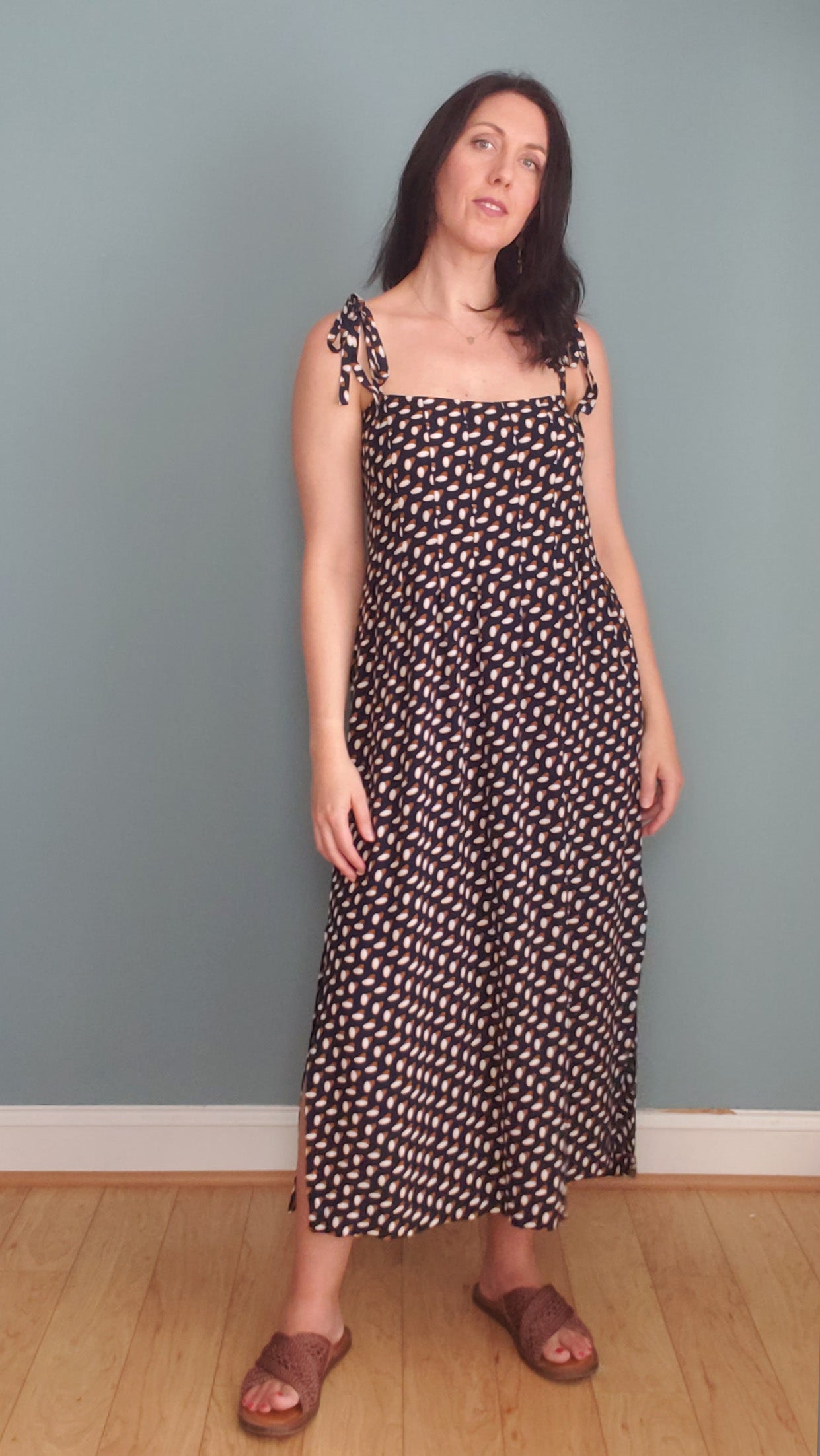 Flora is an easy summer tank or dress with a series of wide tucks across bodice and a flowy skirt. Simple straps tie at the shoulder to customize the neckline fit, with the choice of narrow spaghetti-style straps or wider straps for a more bra-friendly option. Versatile enough to wear as a casual day-dress, date-night outfit, or swimsuit cover-up, Flora will be your go-to summer frock.