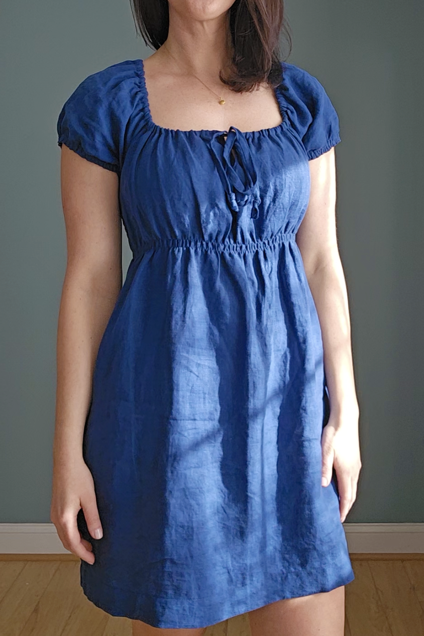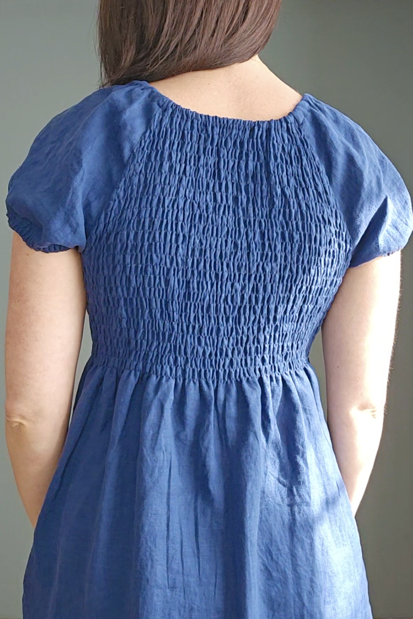 Joni is a peasant-style blouse and dress with raglan sleeves and a square neckline. The neckline is gathered with a drawstring that ties at the center front bodice. The bodice and sleeves are gathered with shirring to add shaping. With its romantic style and comfortable fit, Joni will be your date night go-to or cottage-casual staple for day-to-day wear.